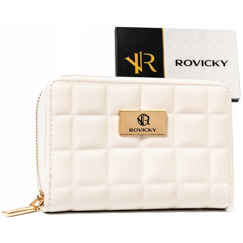 A pénztárca elegáns, modern megjelenésű . Külső felületét jellegzetes , domború négyzetekre emlékeztető dombornyomások díszítik , amelyek háromdimenziós hatást és fényűző megjelenést kölcsönöznek neki. A pénztárca elején egy fém Rovicky márka logó található arany árnyalatban , amely eleganciát ad az egésznek .